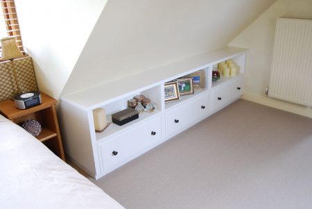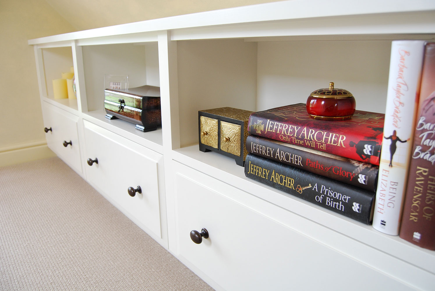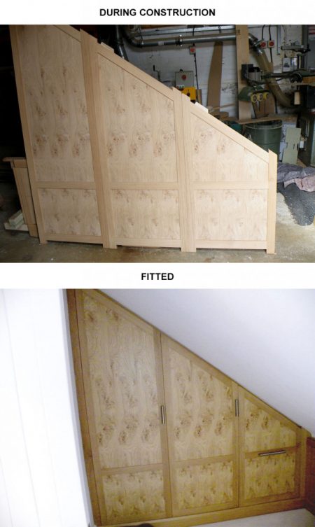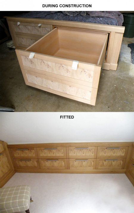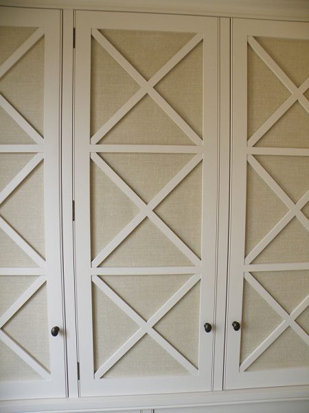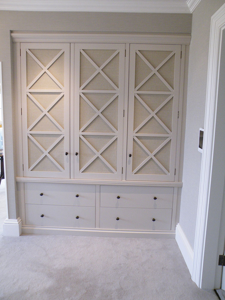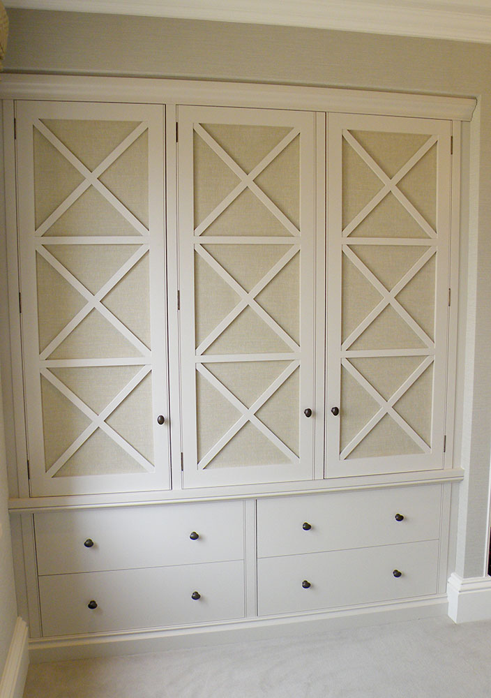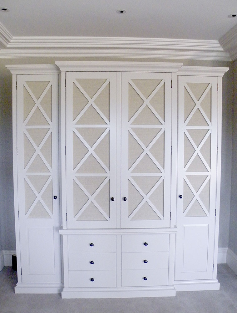 Built in and free standing wardrobes with 'cross design' detailing on doors, backed with fabric. Drawer boxes constructed from solid Cedar of Lebanon and wardrobe interior finshed with a veneer. Designed with Allcroft House Interiors.