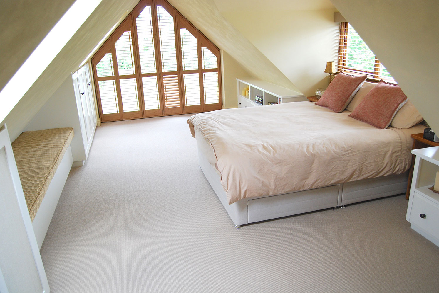 Fitted bedroom furniture with fabric panel cupboard doors. Bedside cabinets made from oak with a stained and lacquered finish. Design - by Allcroft House Interiors.