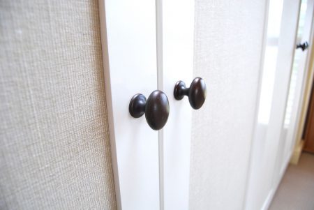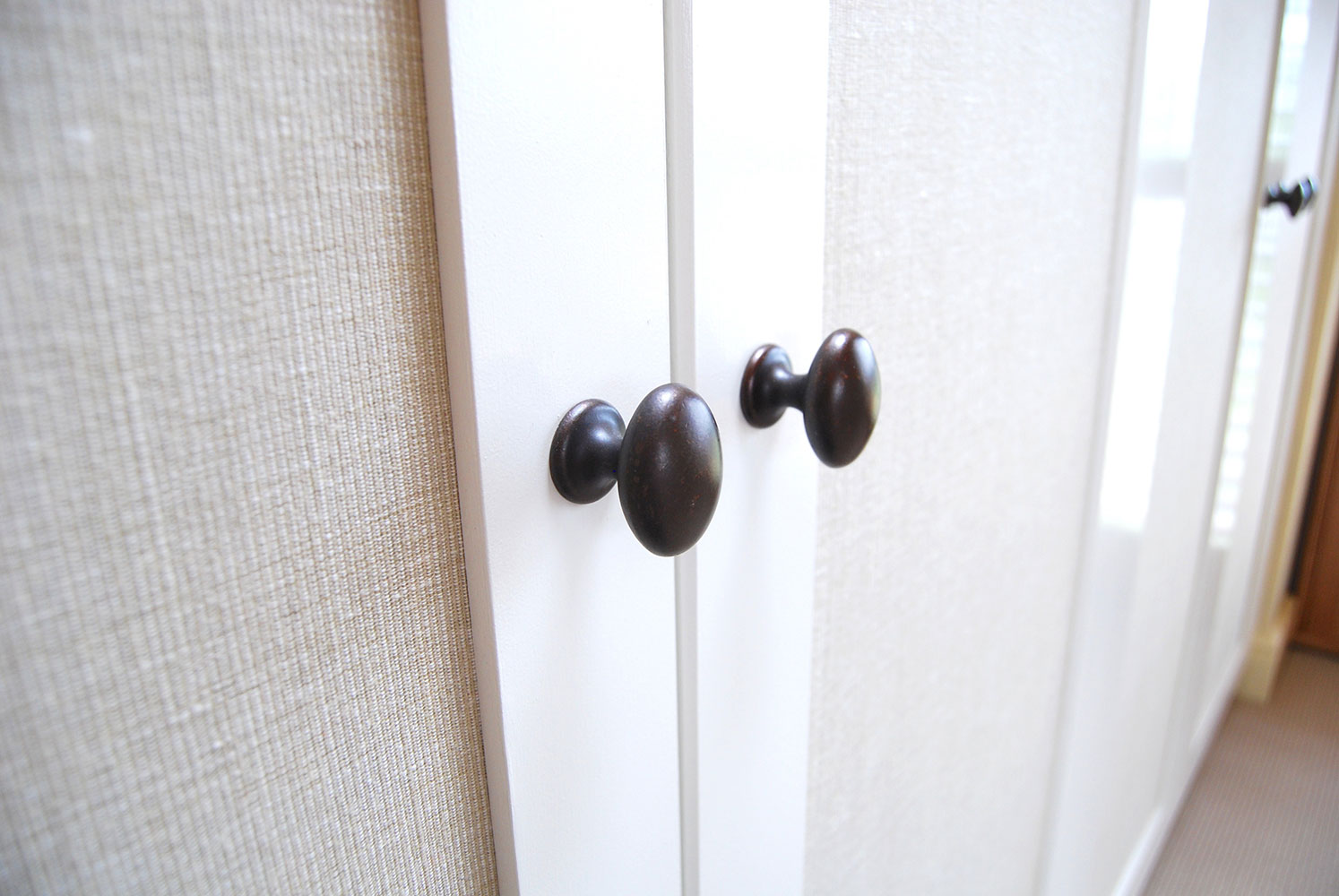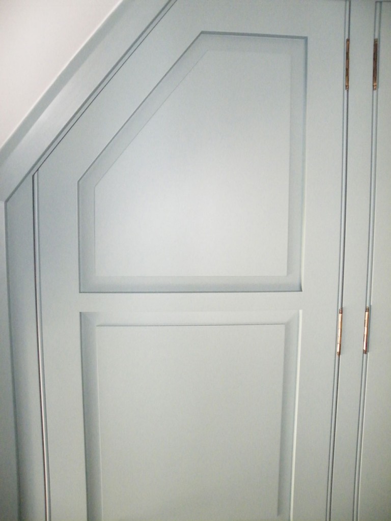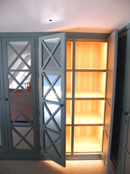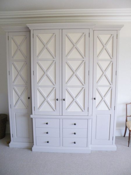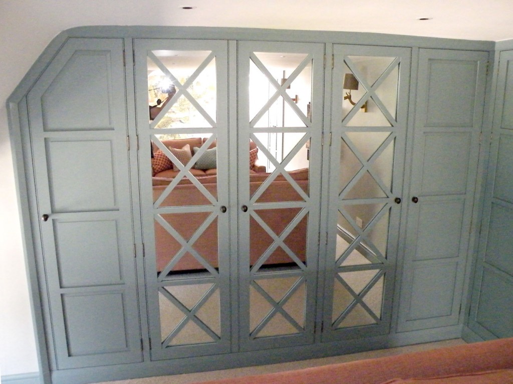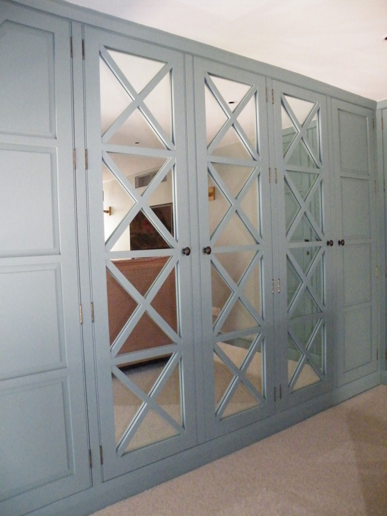 Run of wardrobes and false wardrobes with ‘cross design’ detailing on doors, backed with a mirror. Cedar of Lebanon interiors. Finished with a Farrow and Ball paint.
