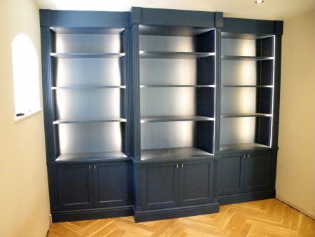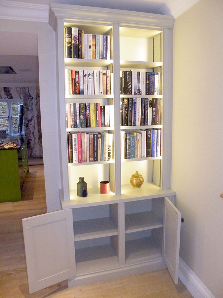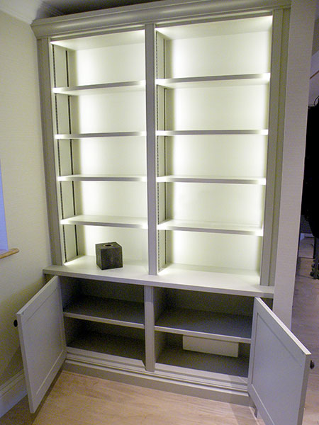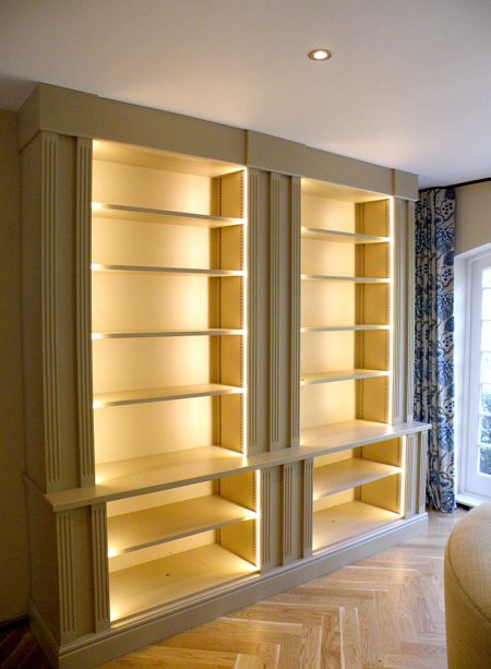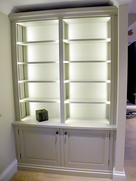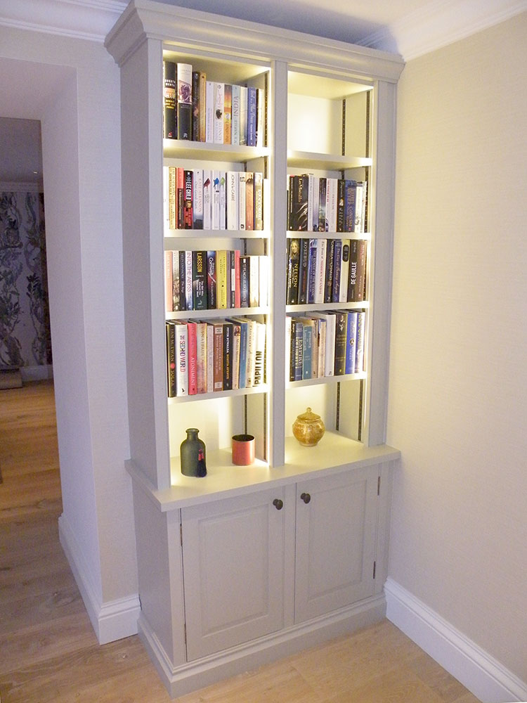 Painted Bookcase in matched Farrow and Ball paint. LED lighting with fluted columns.