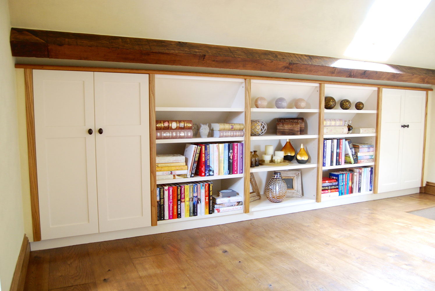 Fitted storage / book cabinet with shaker style doors, solid oak pilasters and capping.