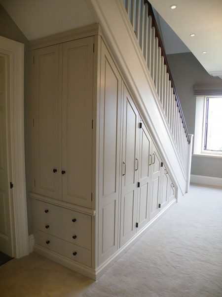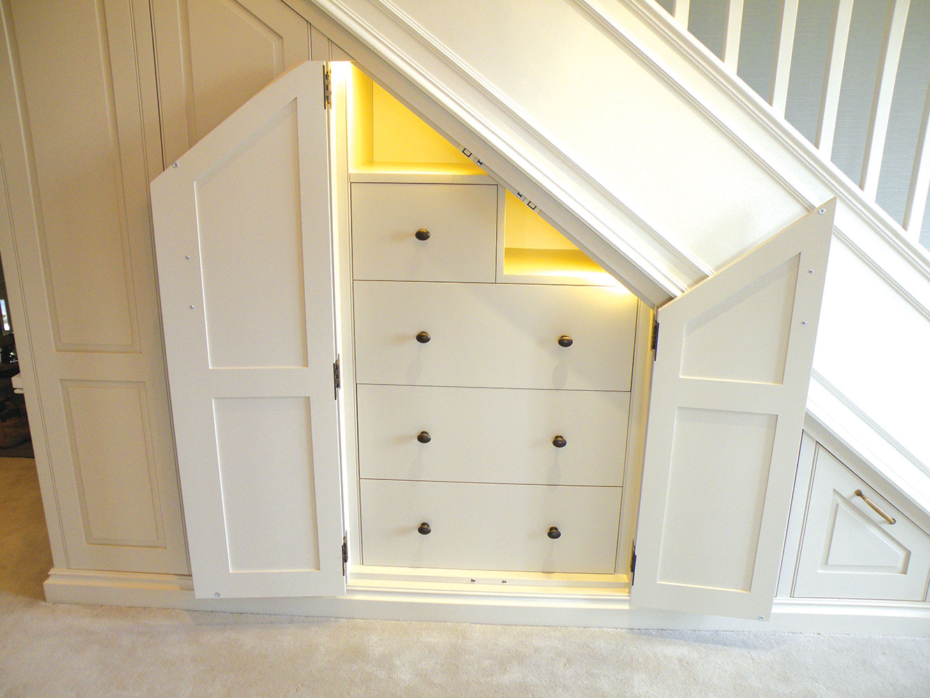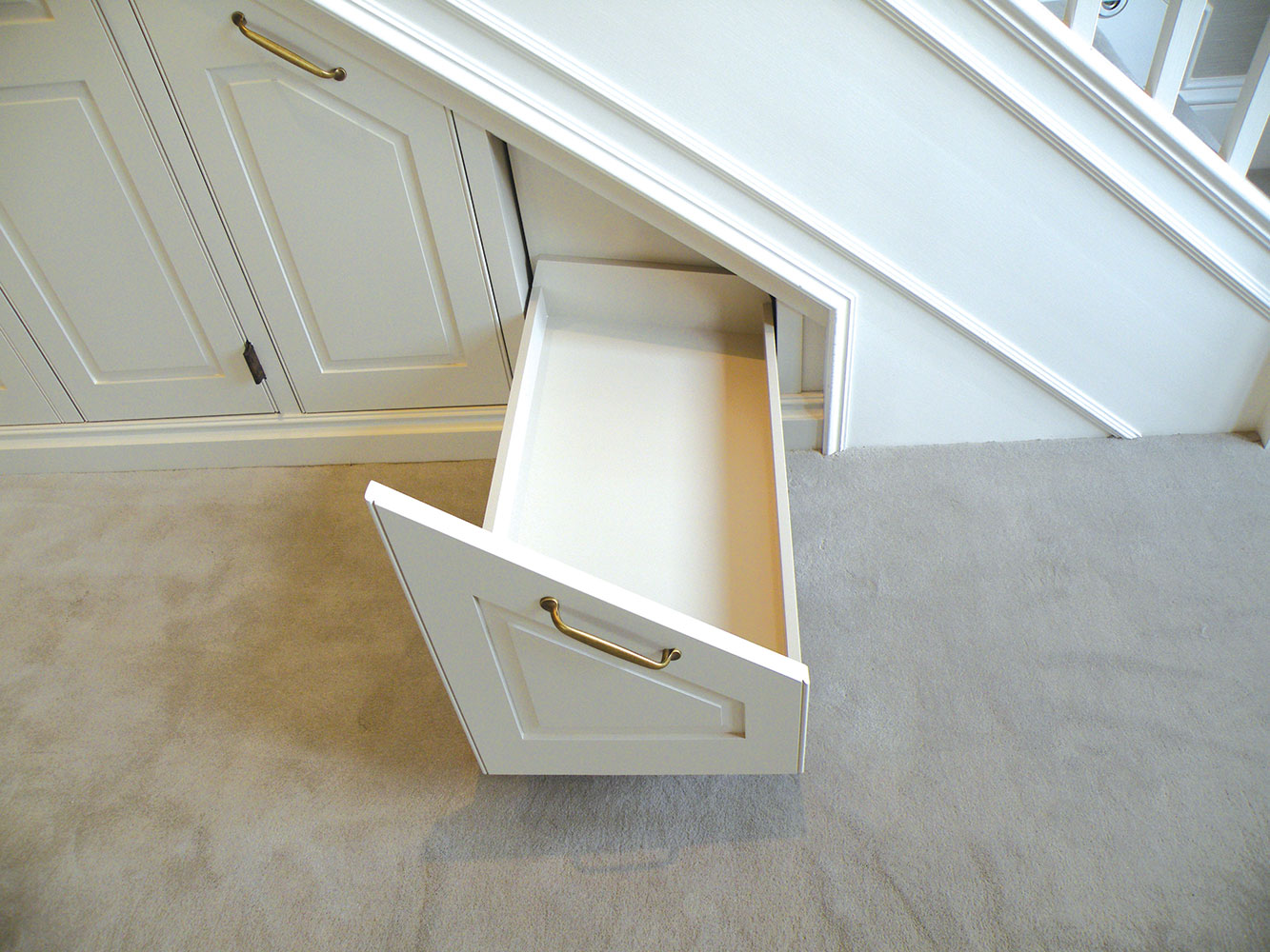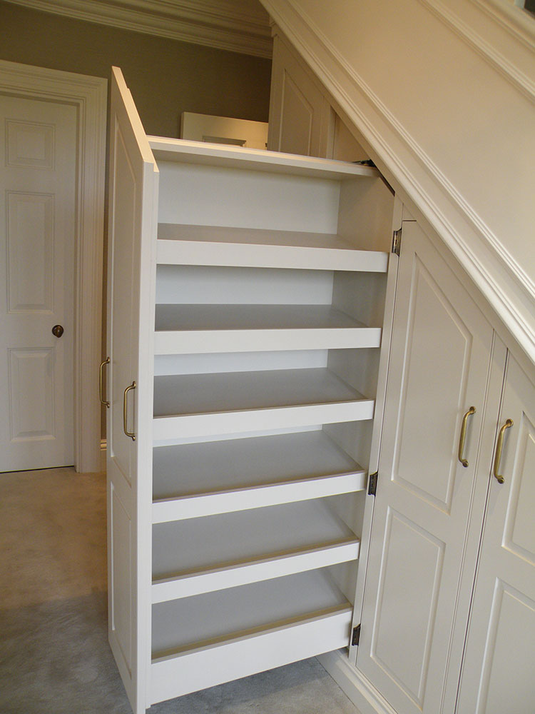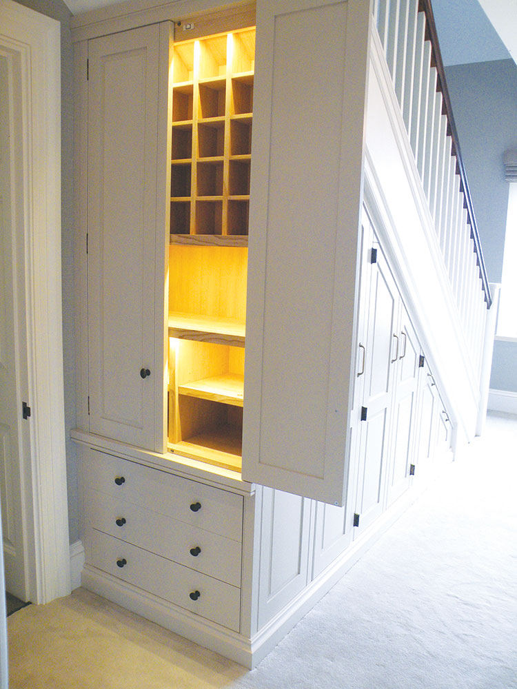 Custom built under stair storage unit, finished with a paint lacquer. Designed with Allcroft House Interiors.