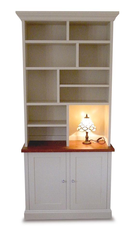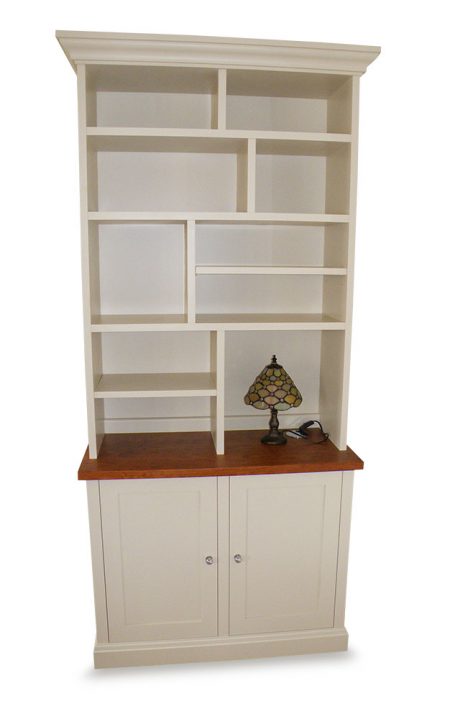 Freestanding painted bookcase with a solid cherry top.