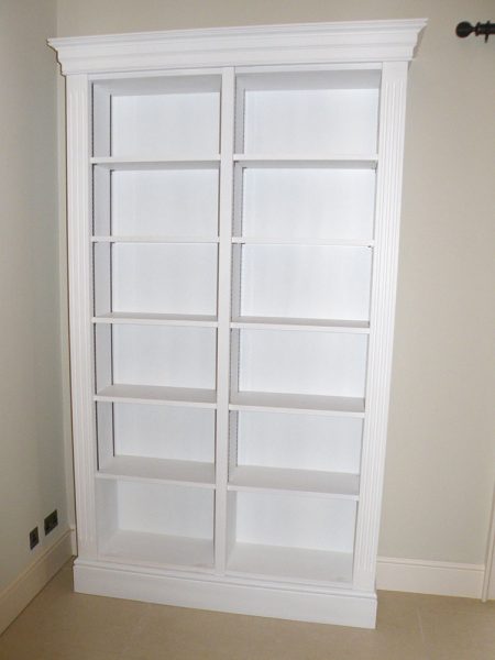 Primed for client to paint. Fluted columns, adjustable shelves on the bookcase strip.