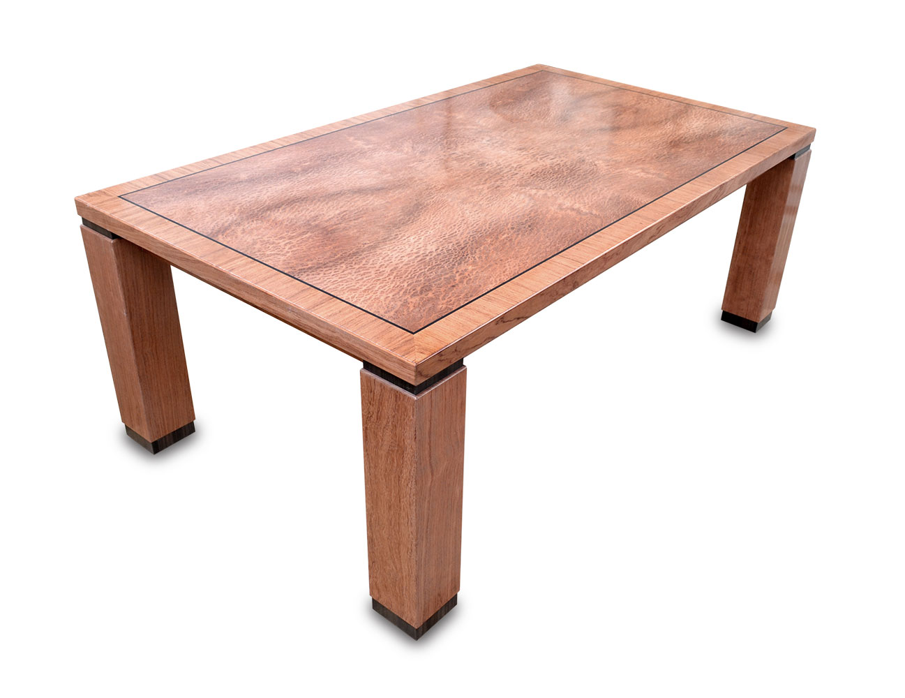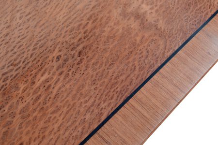 The coffee table under frame and legs are constructed from solid bubinga. The legs feature a high collar detail top and bottom using a black veneer, macassar ebony (stained black). The table top is made of burr vavona with a black line cross banding, in straight grain bubinga. Edge lipping to solid bubinga with mitred corners.