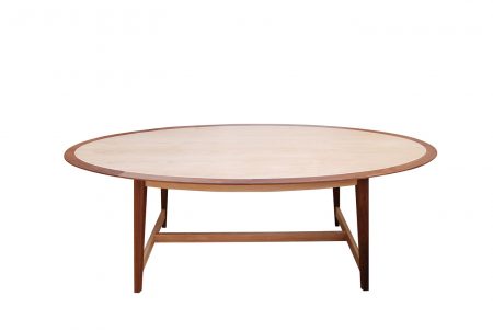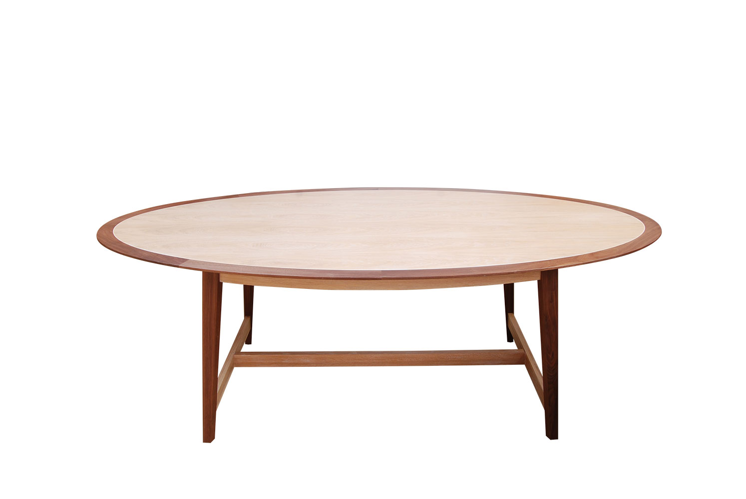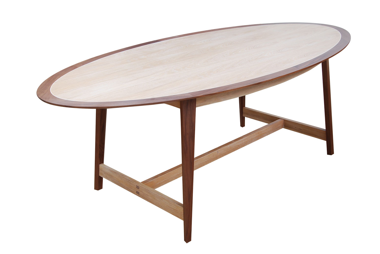 The beautiful ergonomic shape of these elliptical tables allow every one of the 6 people seated at them to see and chat with each other without the need to lean forward, making them a very social and space efficient table. TOP, CENTRE: European limed oak, maple line. LIPPING: Solid American black walnut, under moulded. BASE, LEGS: Solid American black walnut, tapered and chamfered. STRETCHERS & RAILS: European limed oak. Price on application. Call Ray on 07837 397333