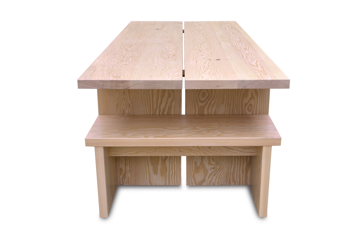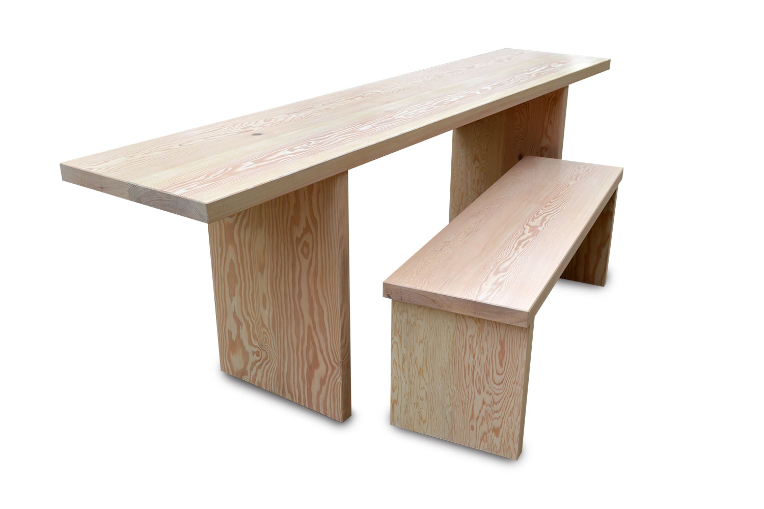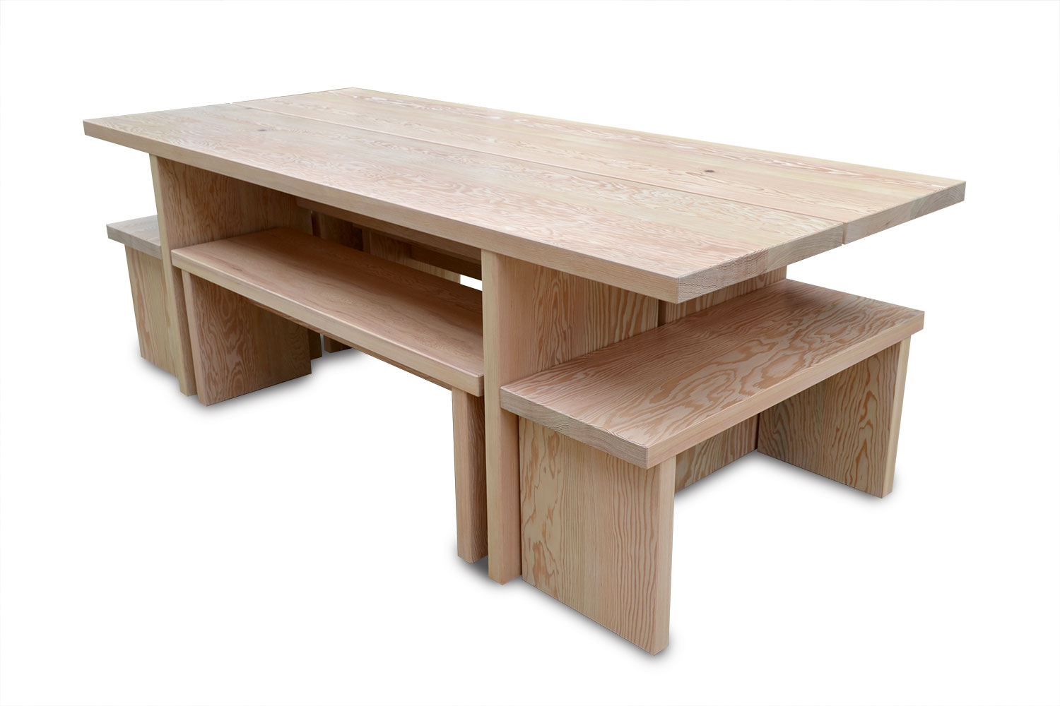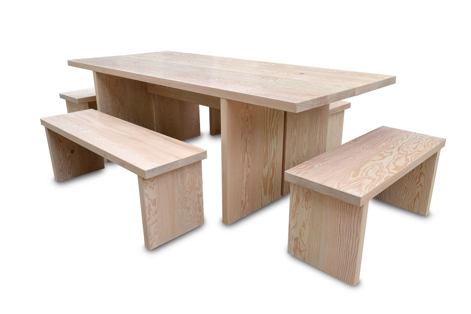 Minimalist table with benches constructed from Douglas Fir and finished with a limed oil. Table seats 6 people and has the option to be divided.