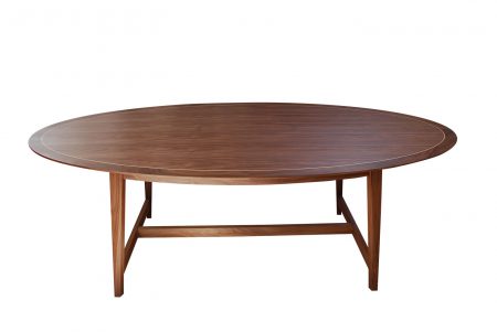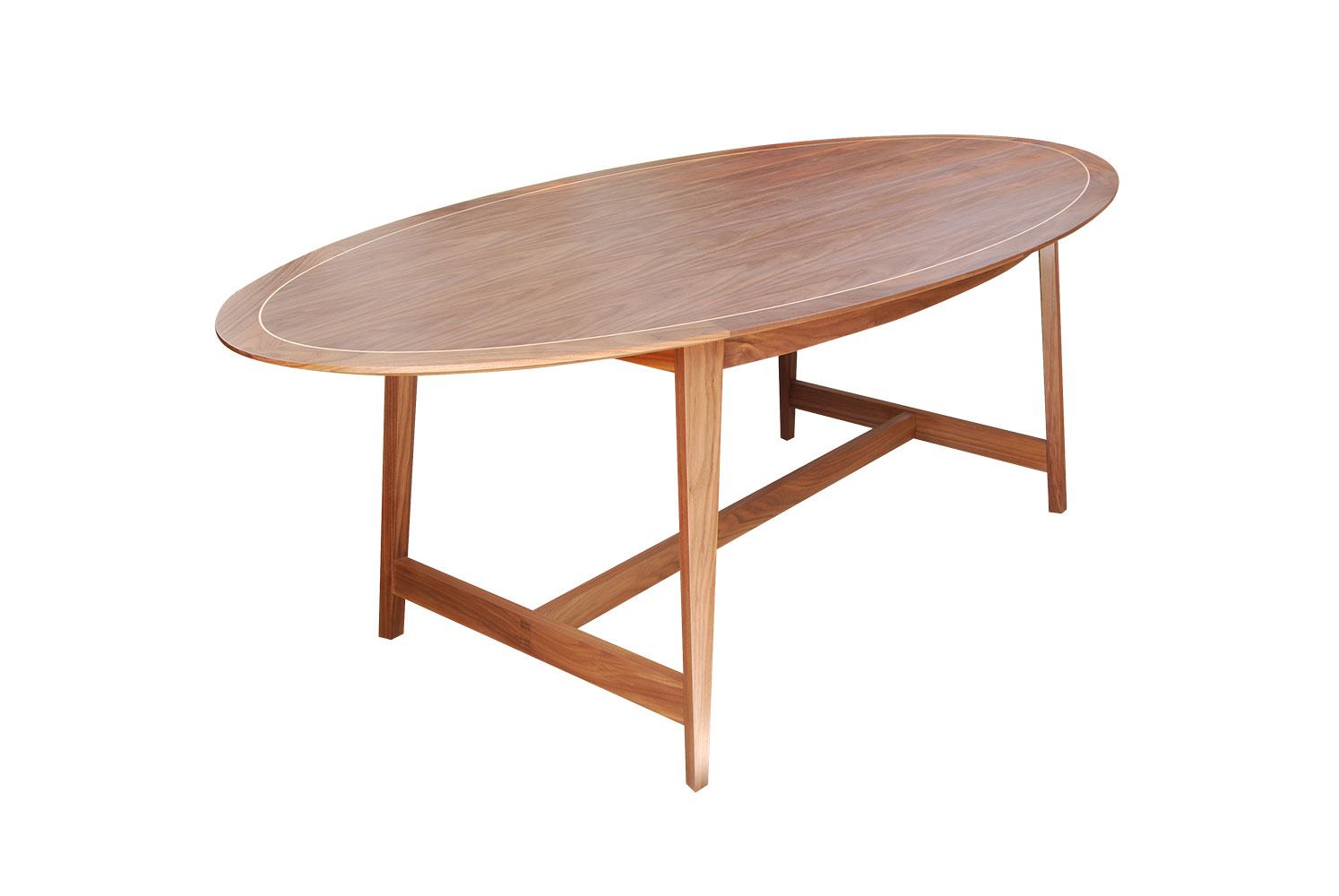 The beautiful ergonomic shape of these elliptical tables allow every one of the 6 people seated at them to see and chat with each other without the need to lean forward, making them a very social and space efficient table. TOP, CENTER: American black walnut veneer. LIPPING: Solid American black walnut, under moulded. BASE, LEGS: Solid American black walnut, tapered and chamfered. STRETCHERS & RAILS: American black walnut.