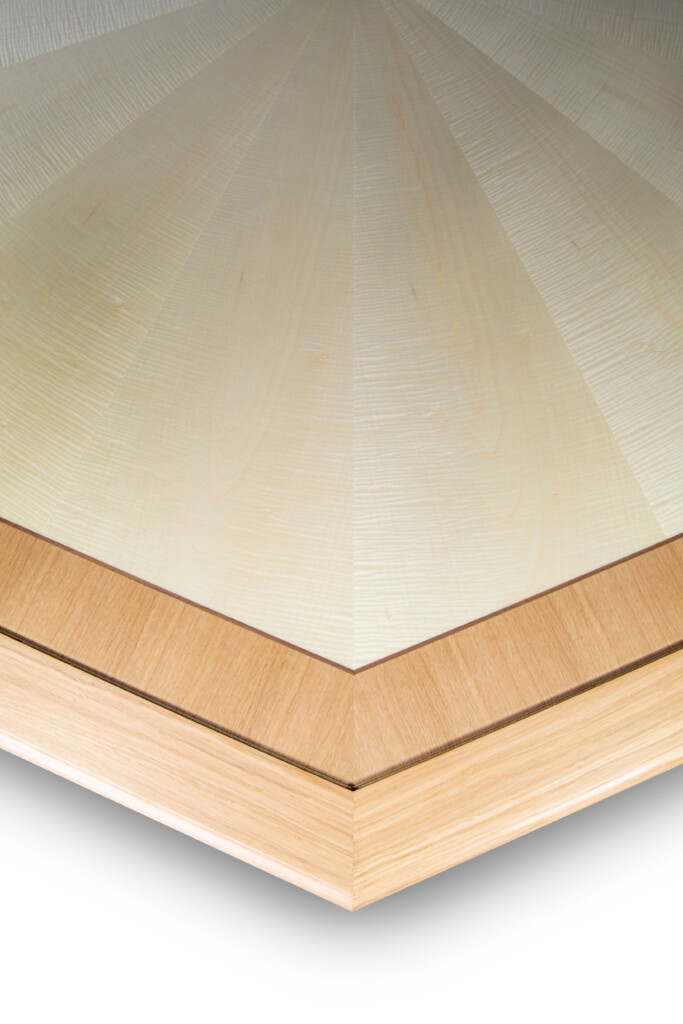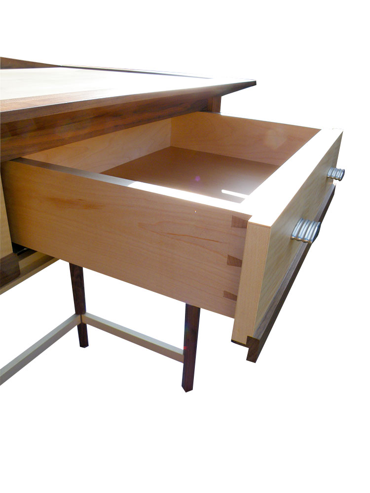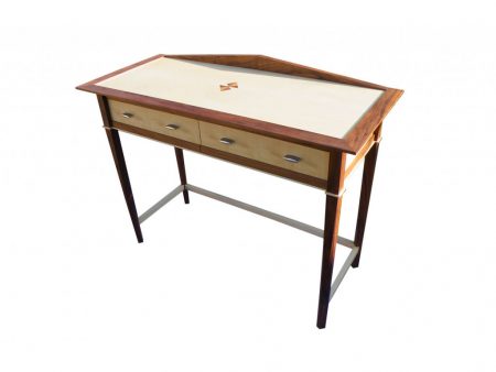 Solid American black walnut and sycamore veneer top and drawer fronts. Abstract diamond decorative inlay using oak and American black walnut.