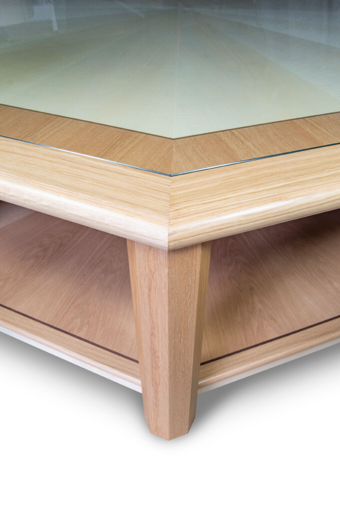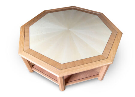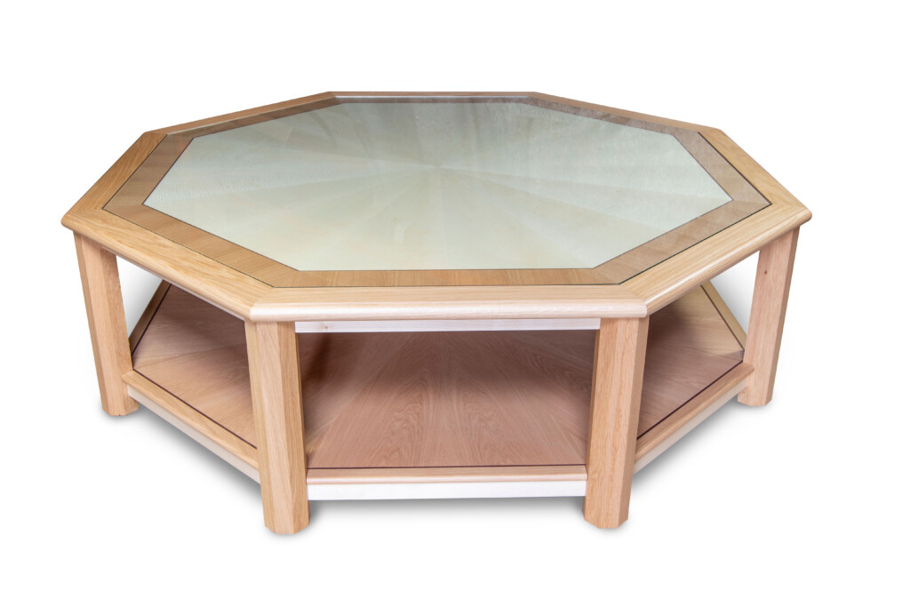 Featuring Radial cut figured sycamore veneer inset top. Radial cut European oak shelf. Solid oak octagonal legs. Moulded solid oak top surround. Octagonal glass inserted top. Price on application. Call Ray on 07837 397333